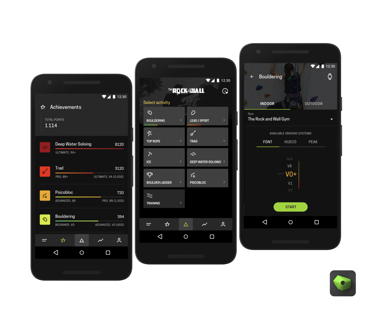 Climbing tracking app with various grade systems, connection with gyms in different regions, and difficulty levels